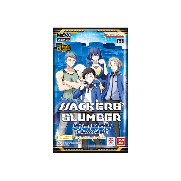 Non è il momento di tirarsi indietro! Cerca dentro di te la potenza suprema, componi una squadra prodigiosa, e preparati ad affrontare nuovi duelli con le carte di Hackers' Slumber! Il 23° set di espansione di Digimon Card Game ti porta nel mazzo personaggi e scene di serie, videogiochi e fumetti dell'universo Digimon: Digimon Story: Cyber Sleuth - Hacker's Memory, Digimon Universe: Appli Monsters e Digimon Liberator!