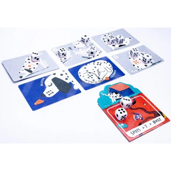 Questi cagnolini bianchi e neri hanno moltissime macchie, e guarda caso anche i dadi hanno macchie sulle loro facce! Abbina i dadi e i cani corrispondenti e completa 6 carte per vincere, ma evita di seppellire in giardino troppi dadi inutilizzabili, perché altrimenti questi cagnotti dai nomi adorabili ci rimarranno male!