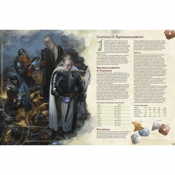- Vivere l’avventura: vengono illustrati alcuni concetti fondamentali che renderanno il viaggio dei nostri eroi più immersivo, come ad esempio lo scorrere del tempo, il movimento dei personaggi, come gestire il riposo fuori e dentro i dungeon.